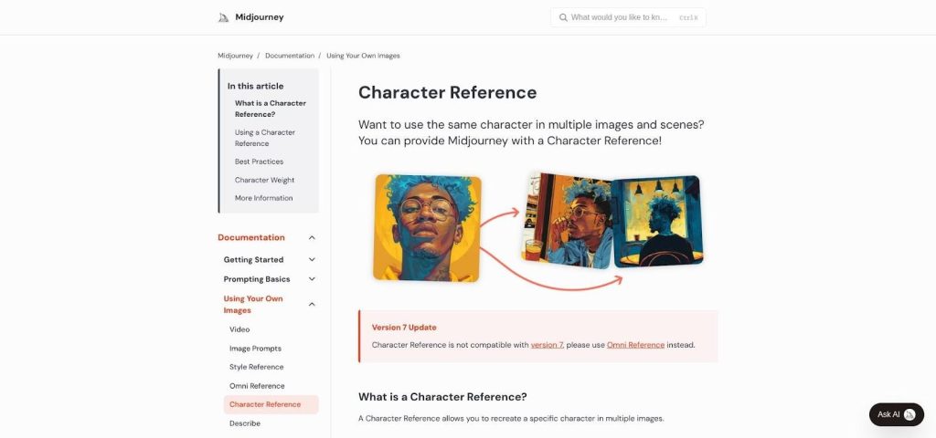 Midjourney character reference and –cref documentation screenshot