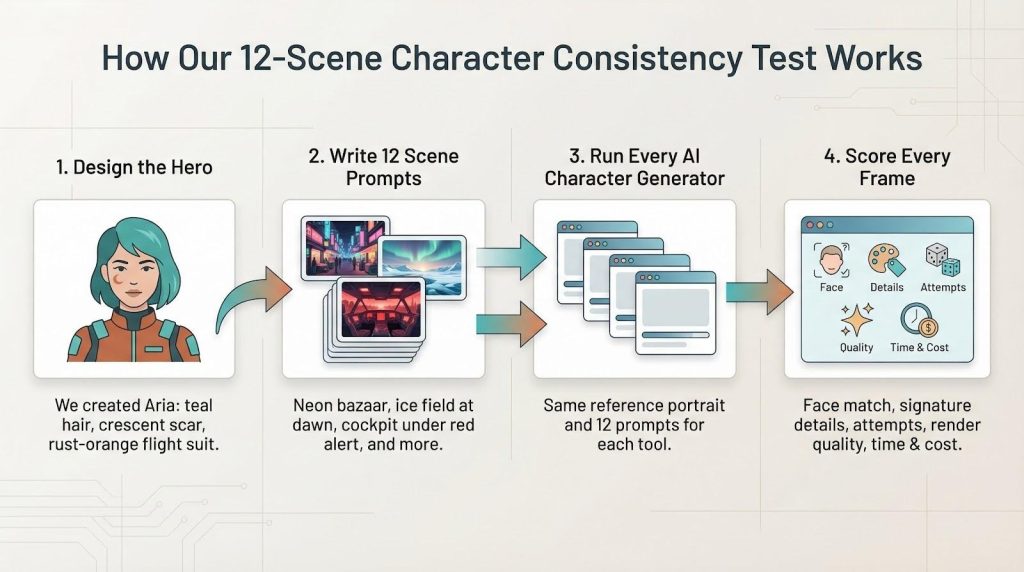 Next, we wrote 12 short prompts that drop Aria into contrasting environments: a neon bazaar, an ice field at dawn, a cramped cockpit under red alert, and more. These prompts stayed identical across every AI character generator.